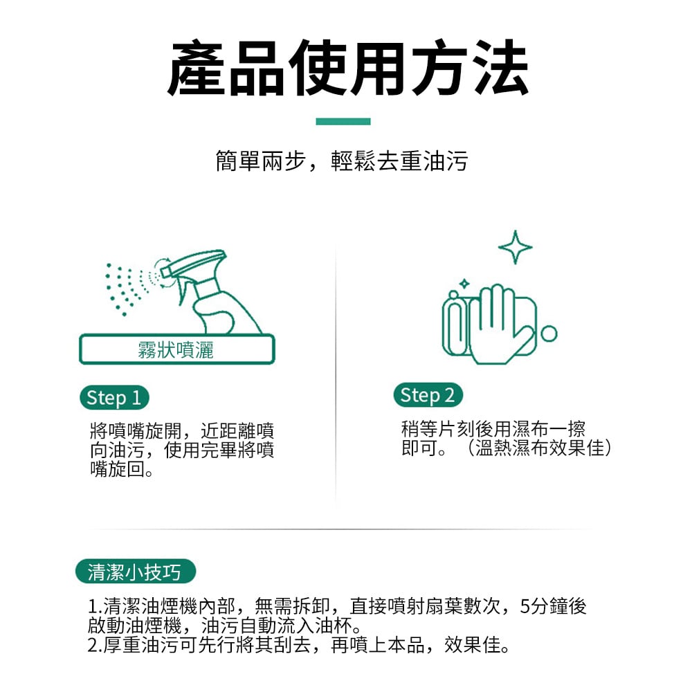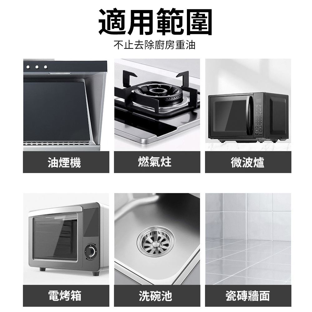 500ml 一噴一擦 強力清潔油污 清新不刺鼻,不傷廚具 產品特性 快速滲入厚重油汙內部使其分解成易清除的液體,自動清除頑固油汙:無需拆卸抽油煙機,無刺激性氣味。 適用範圍 油煙機、燃氣灶、微波爐、電烤箱、洗碗池、瓷磚墻面