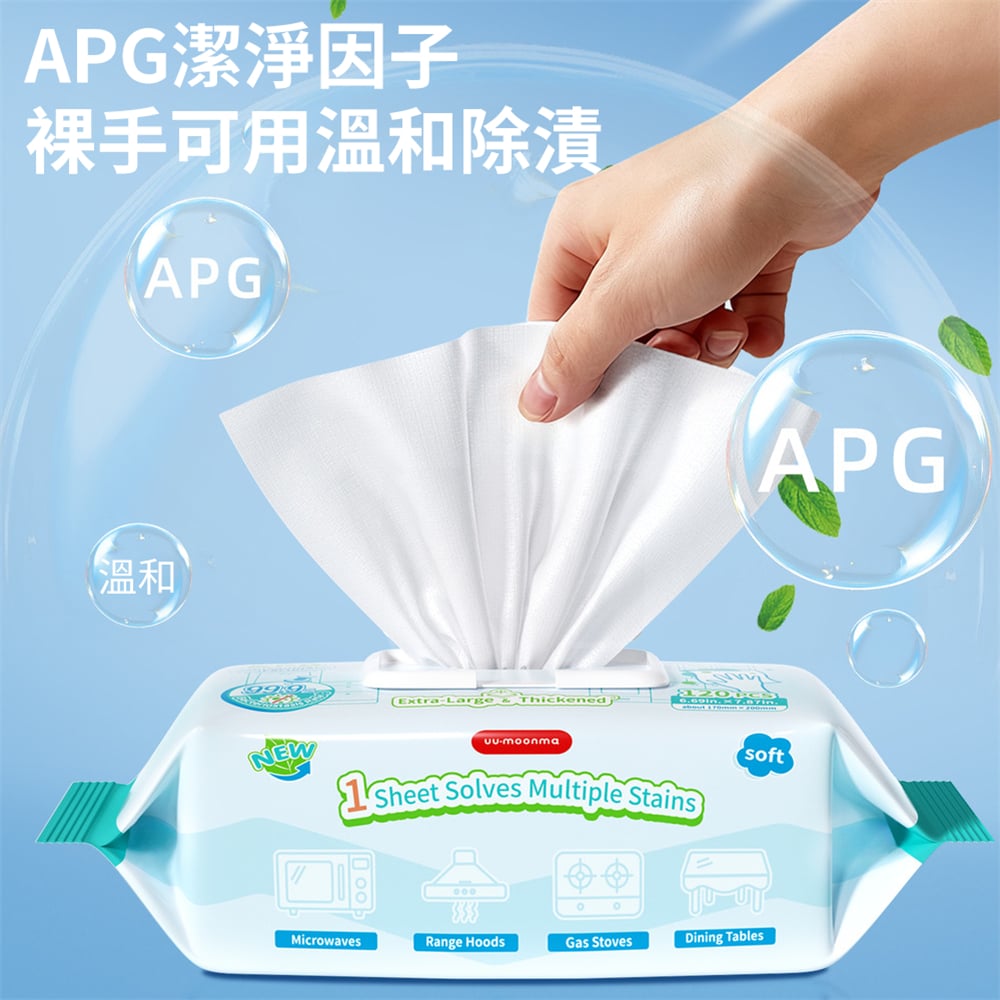 油污不困擾,隨手清潔 炒完菜,抽油煙機和灶台油漬,油膩膩的抹布擦起來費力還會滋生細菌 UYIKU廚房清潔濕巾 擦后即棄 抑菌守護家人健康 用於餐具、油煙機、廚具、灶台等清潔
