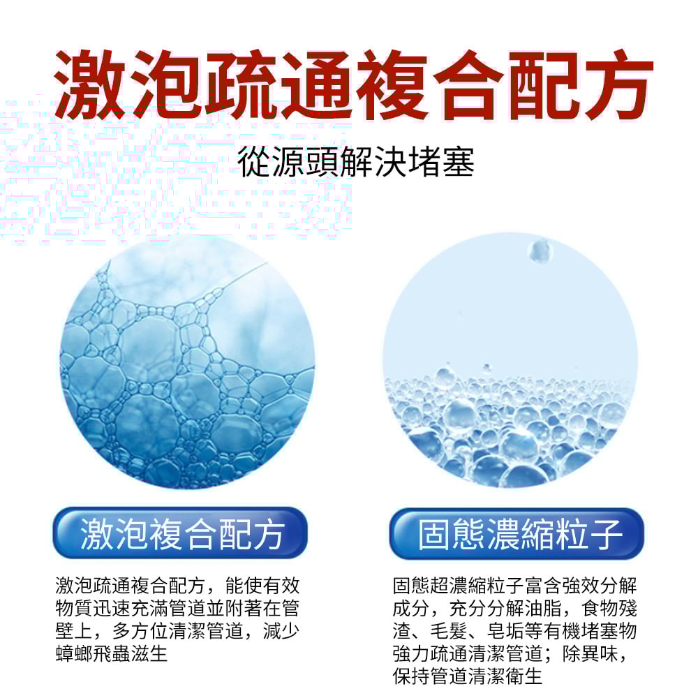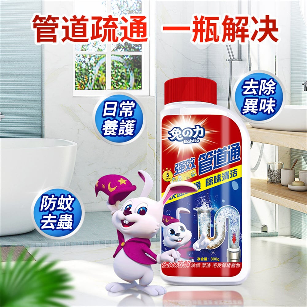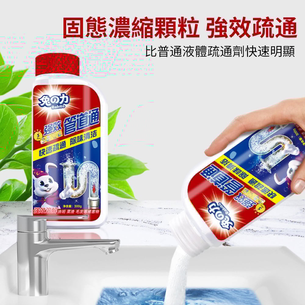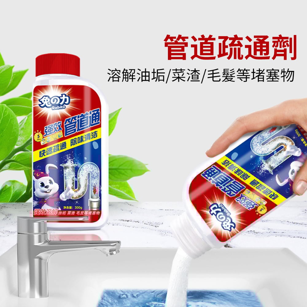 活氧技術 高效疏通 300g 溶解油垢 / 菜渣 / 毛髮等堵塞物 日常養護、祛除異味、防蚊去蟲 固態濃縮顆粒,比普通液態疏通劑快速明顯