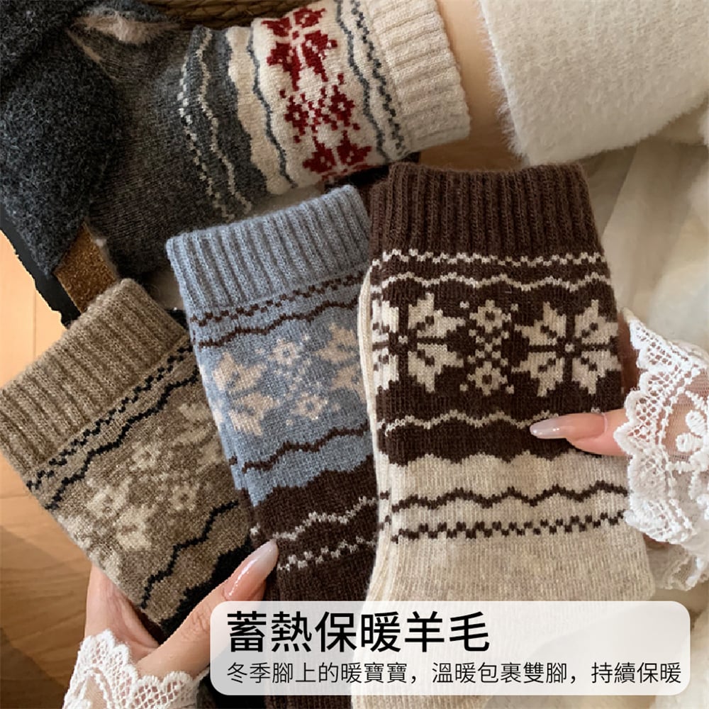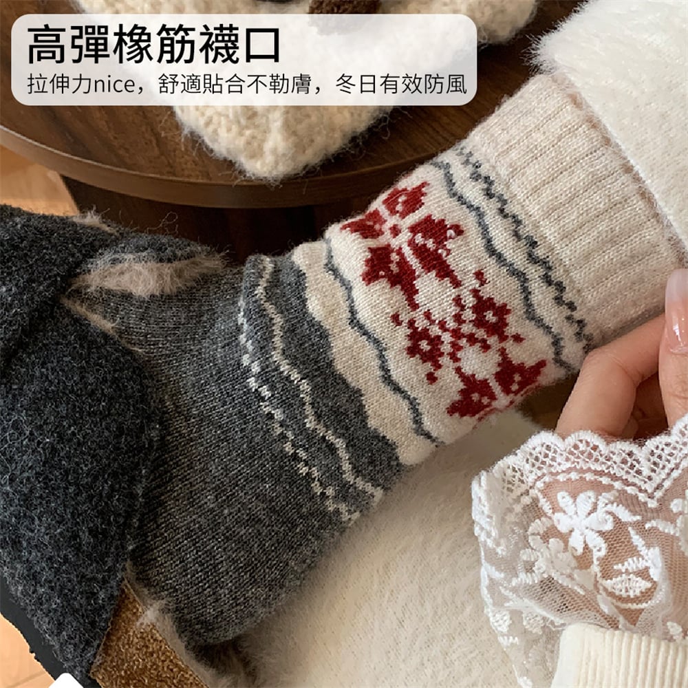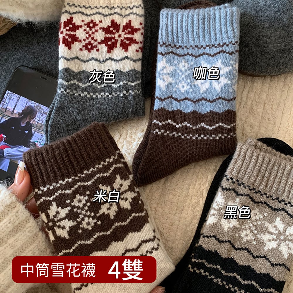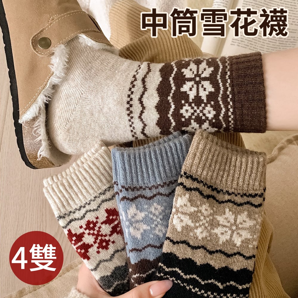 復古潮流襪子 中筒襪 女襪 加厚條紋襪 雪花紋堆堆襪 保暖襪子 4對 [平行進口] HK2534