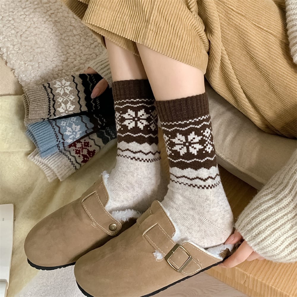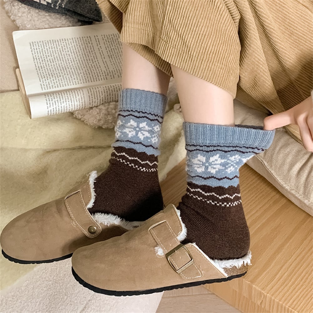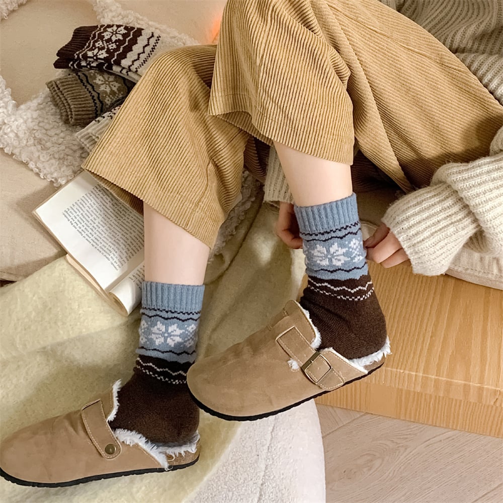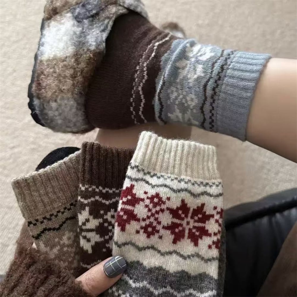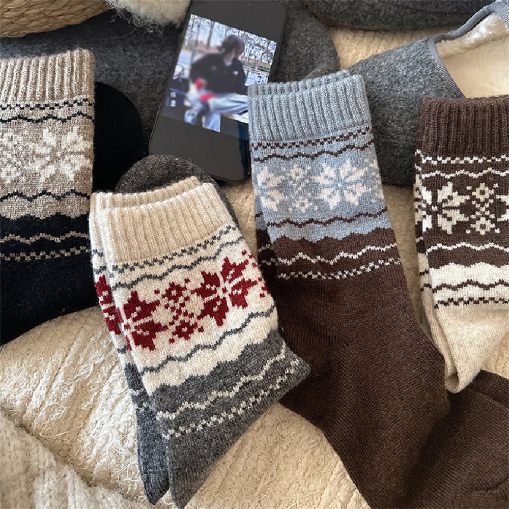 復古潮流襪子 中筒襪 女襪 加厚條紋襪 雪花紋堆堆襪 保暖襪子 4對 [平行進口] HK2534