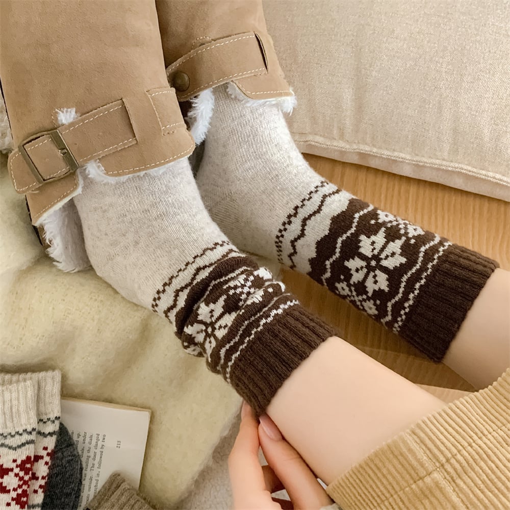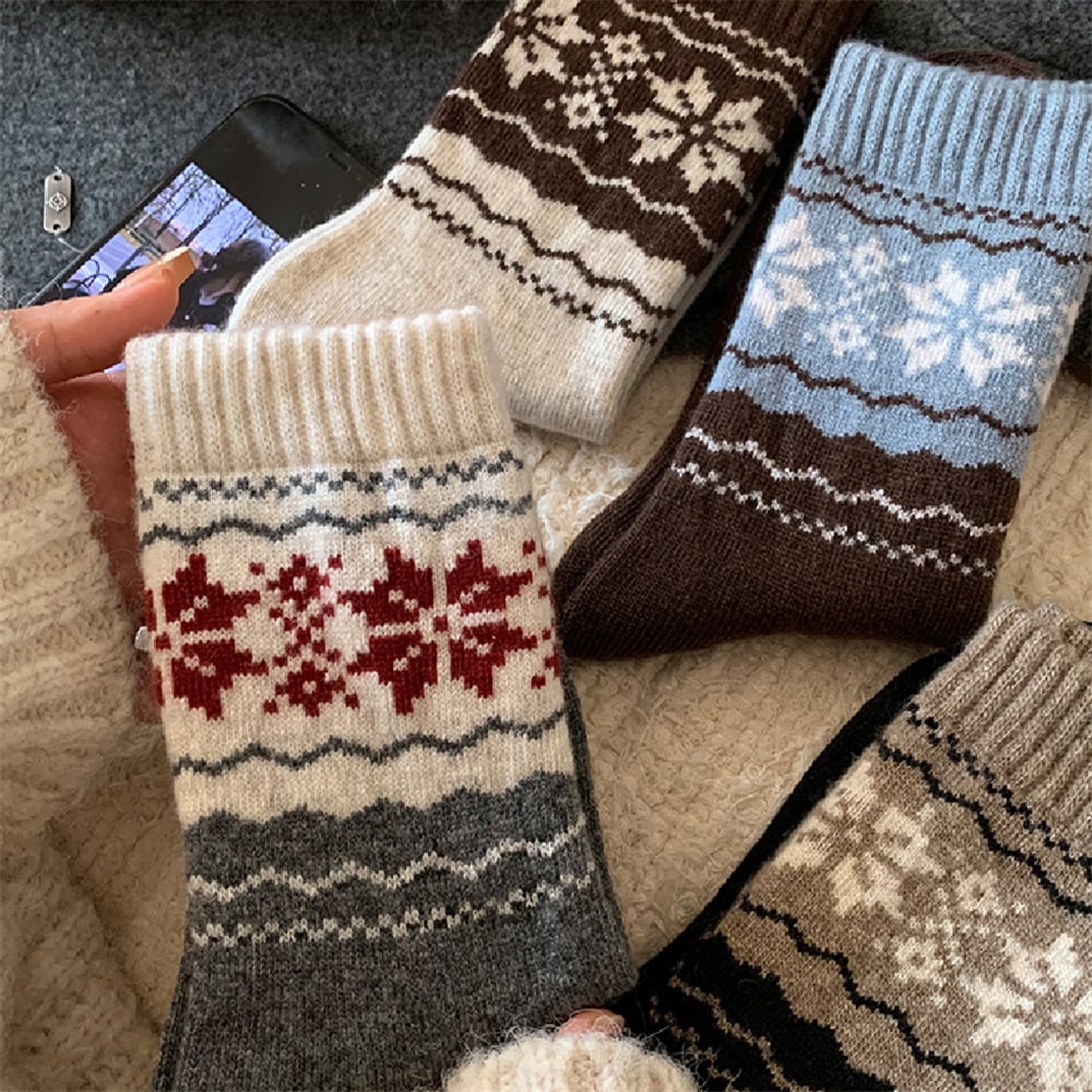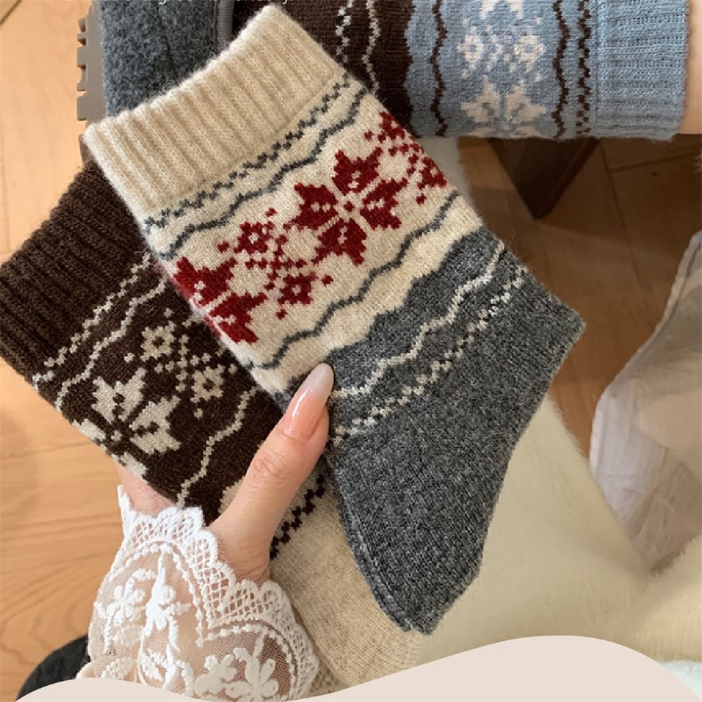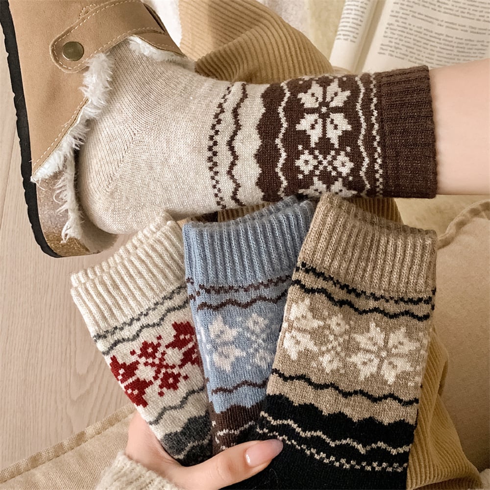 復古潮流襪子 中筒襪 女襪 加厚條紋襪 雪花紋堆堆襪 保暖襪子 4對 [平行進口] HK2534