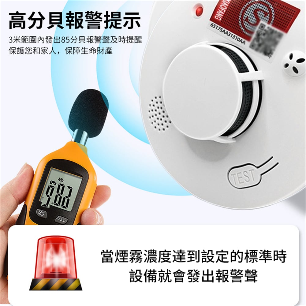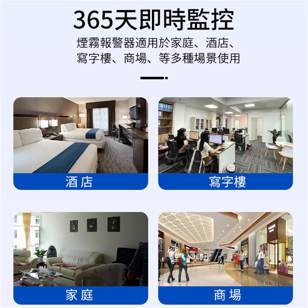 當煙霧濃度達到設定的標準時,設備就會發出報警聲。 現場聲光報警、耗電少、ABS阻燃材料、低电量提醒 3米範圍內發出85分貝報警聲提醒 低电量提醒更换电池 適用於酒店、寫字樓、家庭、倉庫、商場等