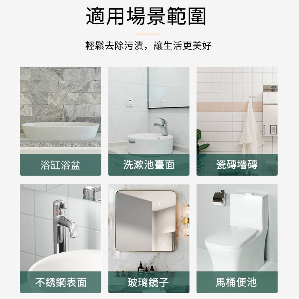 瓷磚清潔 強力除垢 祛除表面污垢 提升石材光亮度 適用範圍:各類天然石材如花崗岩、大理石、人造石、英石各類瓷磚等 適用於:浴缸浴盆、不鏽鋼表面、洗漱池檯面、玻璃鏡子、瓷磚牆磚、馬桶便池