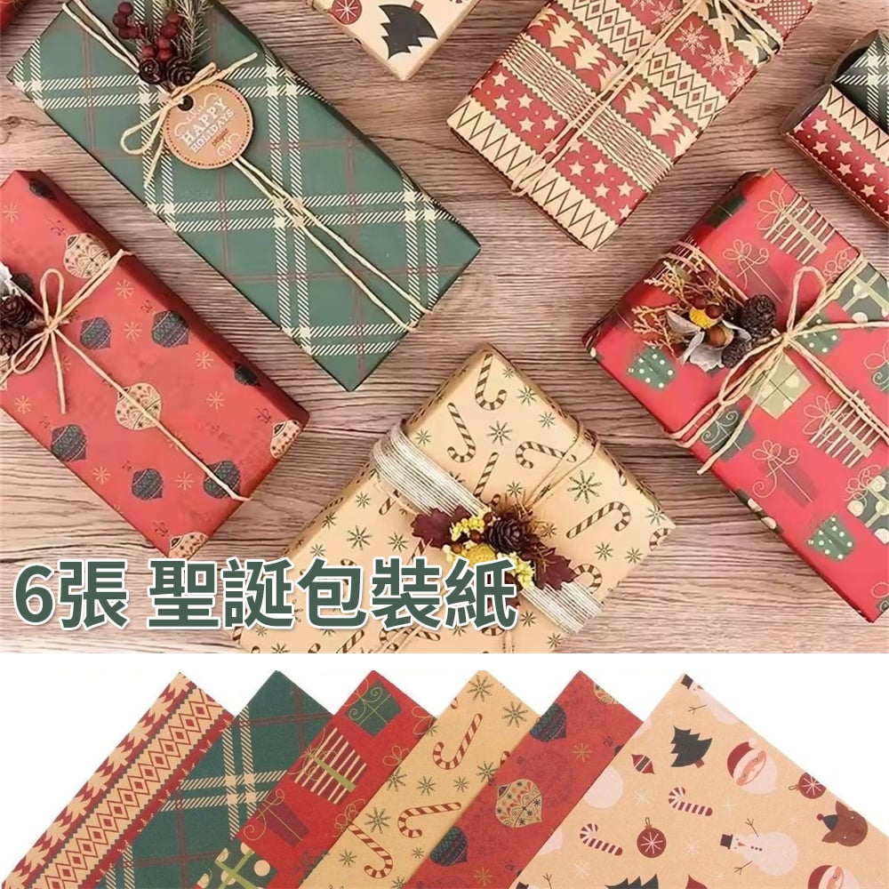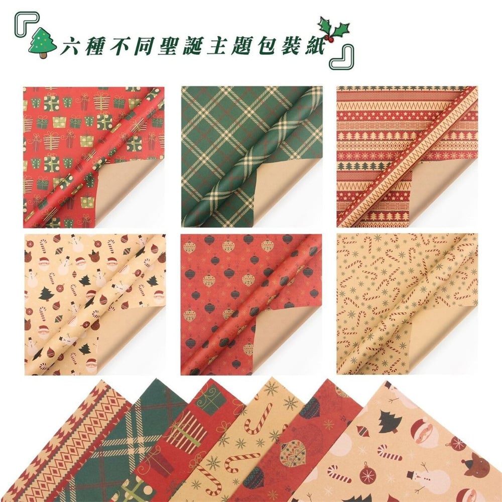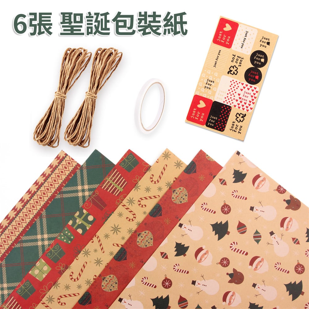 規格:50*70cm 6 張不同款包裝紙 + 2 捆牛皮紙繩子(10 米 / 捆)+1 卷雙面膠 + 1 張貼紙 可用與聖誕禮物包裝、聖誕花束包裝、聖誕手工製作、聖誕裝飾。