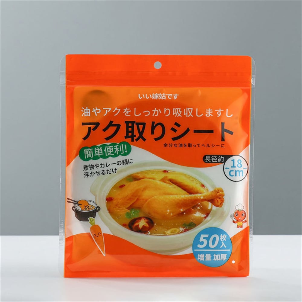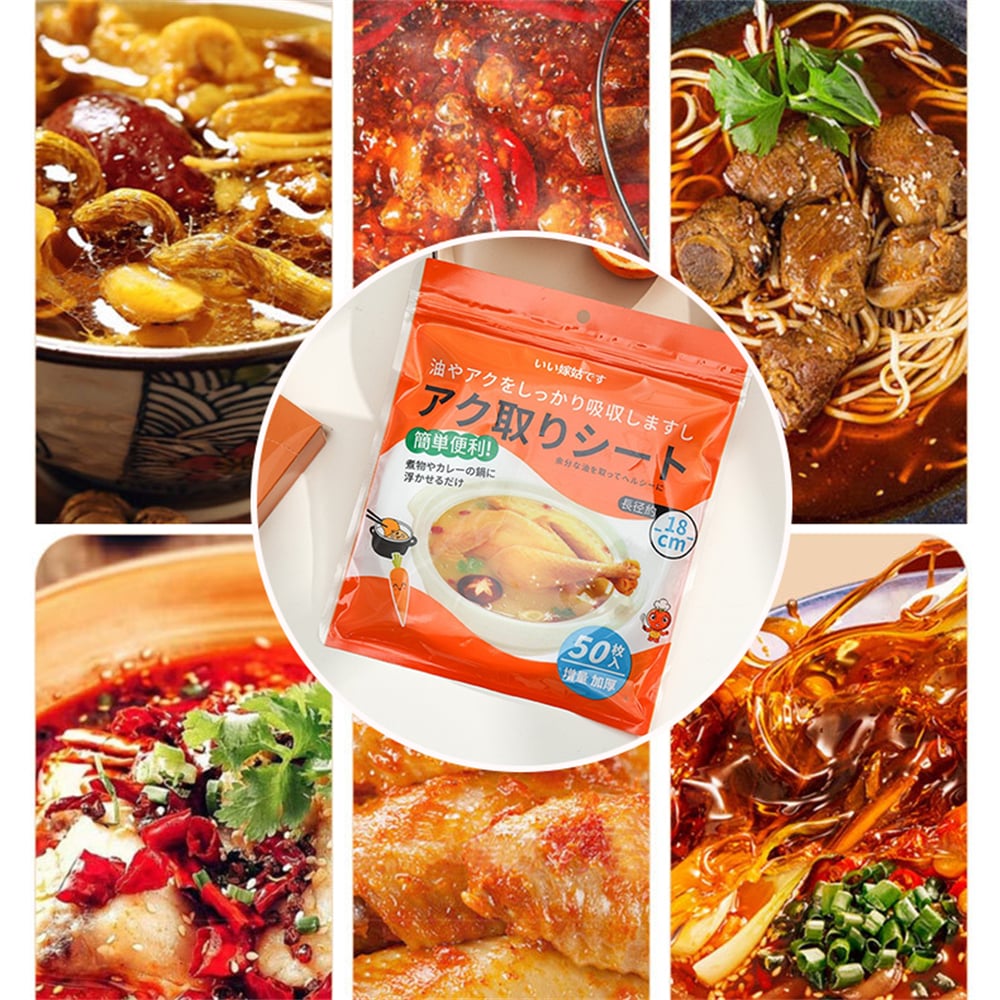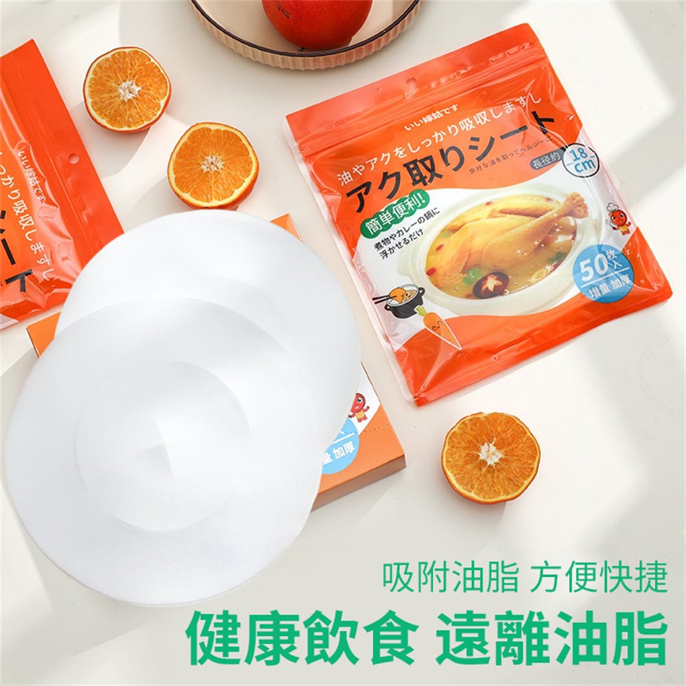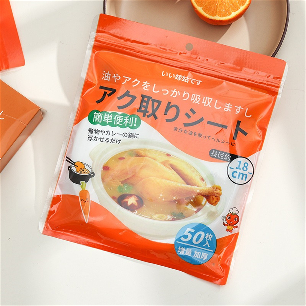 50張一包 自封口 更衛生 吸附油脂 食品級材質 方便快捷 健康飲食,一次性使用方便省心 開口創意設計 鎖定油脂不漂浮 煲湯時用於吸附漂浮在表層的油水和浮沫,墊在煎炸食物底部可吸附食物上多餘的油脂
