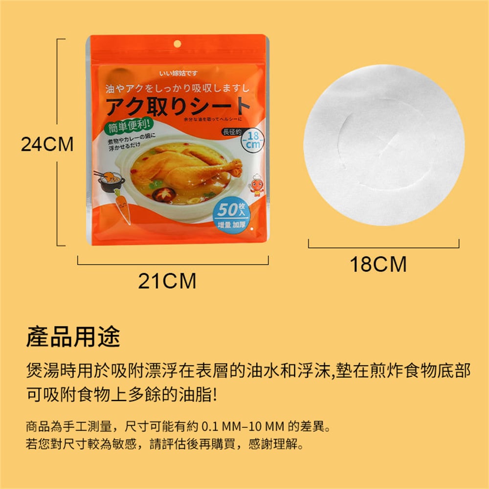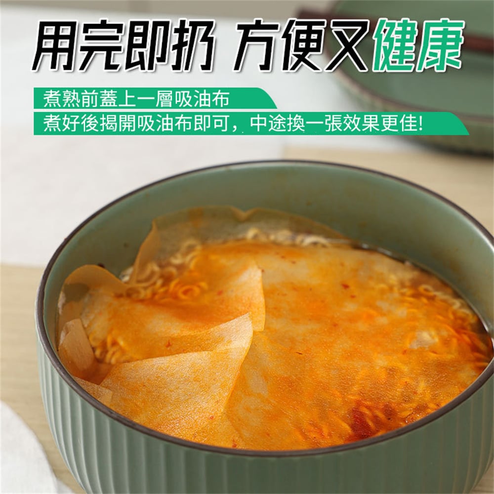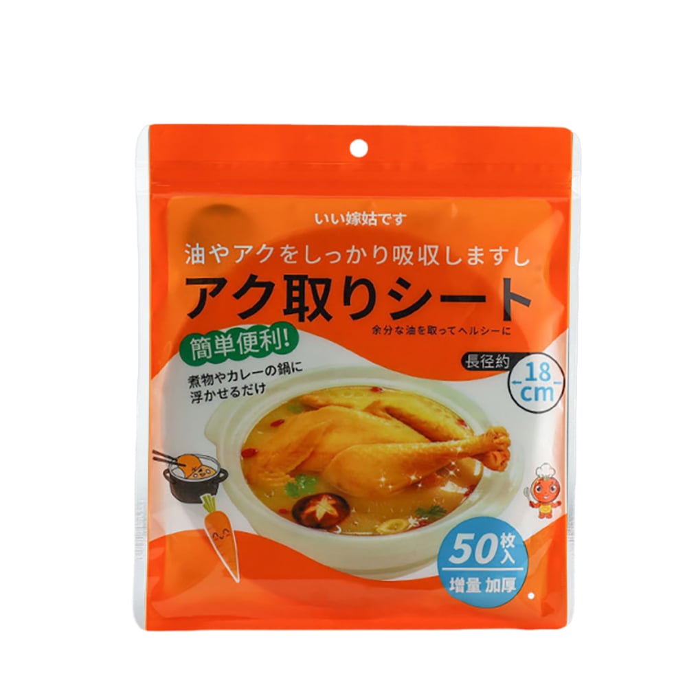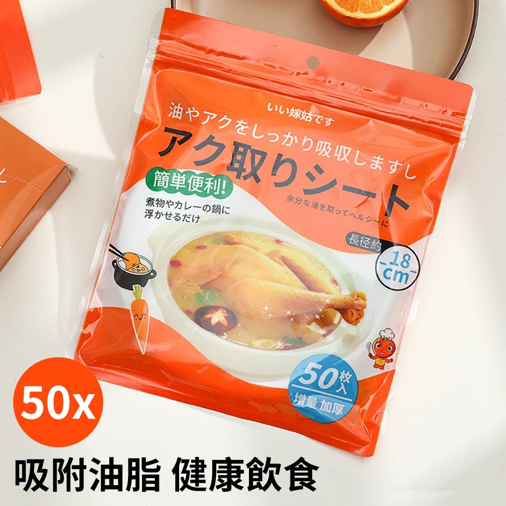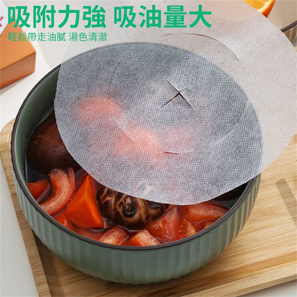 50張一包 自封口 更衛生 吸附油脂 食品級材質 方便快捷 健康飲食,一次性使用方便省心 開口創意設計 鎖定油脂不漂浮 煲湯時用於吸附漂浮在表層的油水和浮沫,墊在煎炸食物底部可吸附食物上多餘的油脂